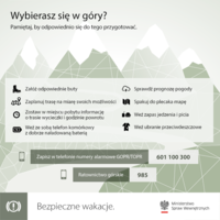 Tuż przed wyjściem zostawiamy w miejscu pobytu wiadomość o trasie wycieczki i przewidywanej godzinie powrotu. Jeśli zmieniamy plany, nie zapomnijmy o tym powiadomić. Weźmy ze sobą telefon komórkowy z naładowaną baterią. W katalogu numerów telefonów koniecznie zapiszmy numery alarmowe: 601 100 300 oraz numer 985. Zgłaszając telefonicznie wypadek, zanim się rozłączymy, poczekajmy na potwierdzenie przyjęcia zgłoszenia.