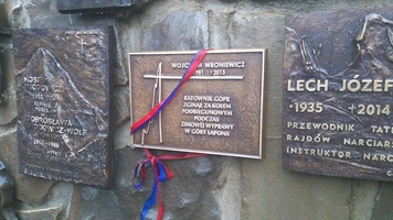 26 września w Sanktuarium Matki Boskiej Jaworzyńskiej na Tatrzańskich Wiktorówkach odbyło się poświęcenie i odsłonięcie tablicy upamiętniającej przedwczesną śmierć naszego kolegi Wojtka Wroniewicza. "WRONA" zginął podczas wyprawy zimowej za koło podbiegunowe. Był wspaniałym kolegą, świetnym organizatorem i ratownikiem, a przede wszystkim bardzo dobrym ojcem i mężem. Odszedł od nas w marcu 2013 roku.